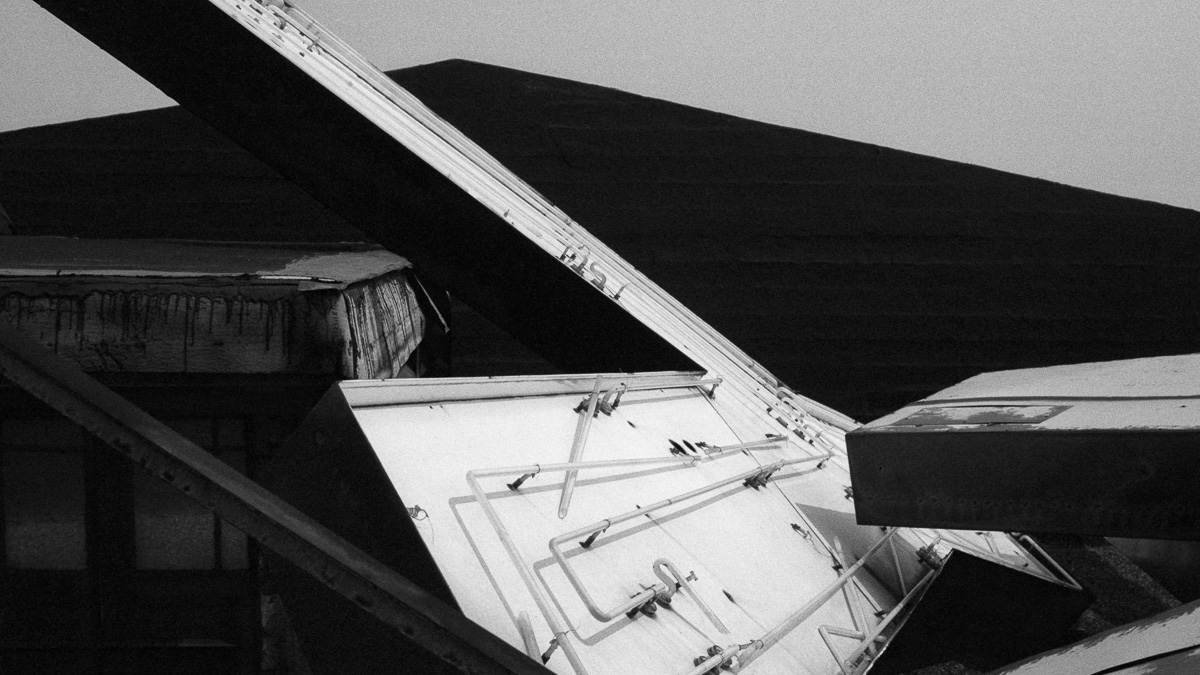 Massive letter forms rested on the roof after years of visibility to name the home of Uniroyal Tires.